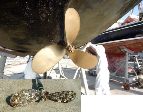 15年も使うと金属製のスクリューもあちこちに傷が目立つ。 一式交換。ペラだけではないのでこれが結構大変。