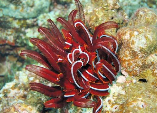 英名はクリスマスワーム。 こちらの呼び名の方が喜ばれそうです。 正体はゴカイの仲間なのですが本体は珊瑚の中に隠れていて 一対の鰓冠だけを露出させています。 大きさは直径1cmほどです。 この鰓冠が色とりどりで(赤青黄白黒などなど) 群生しているとこ…