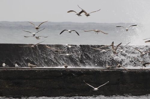 雪が降りそうな陽気 防波堤には風を避けているのでしょうか、数百羽の鴎が群れていました。 時折襲ってくる波。その飛沫を避けようとバッと飛び立ちます。 普段水の上にいるくせにですよ。