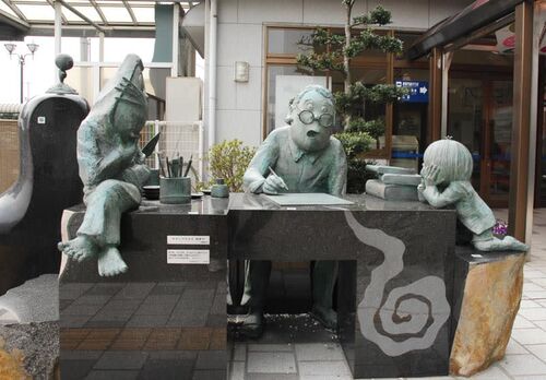 境港の駅前には原稿を描いている 水木しげる像がありました。