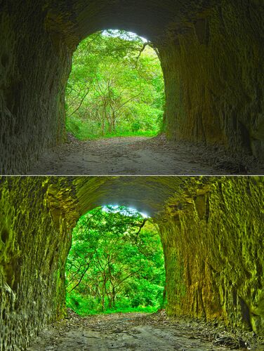 トンネルの中からの撮影です。 9枚の露出の異なる画を合成いたしました。 http://blue.zero.jp/poseidon2/degi/HDR/hdr.html 合成してからの後の処理がCS2と比較するとあれこれできます。