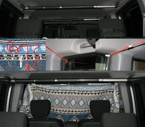プラスチック段ボールのブラインドの前に作りました。 前席には五つのウィンドウがあります。 そのすべてをブラインドで覆うのは面倒です。 前後席の間に仕切をつければ一枚で済みます。 最初に考えたのは左右グリップに渡したバーに紐を沿わせてそれにカー…