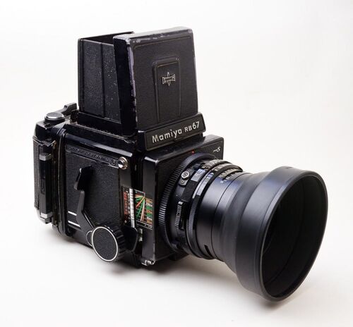 1970年発売の RB67です。Pentax6×7が35mmSLRを巨大化したタイプでしたがこれはブロニカ・ローライ・ハッセルと同様なオーソドックスな形状です。 ピント合わせは左右にあるノブを回して合焦するラック&ピニオン式。蛇腹を採用しているので近接撮影にかなり…