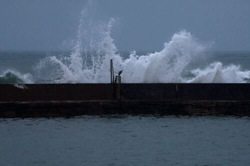予報通り降ったり止んだりです。 雨量はたいしたことはありませんが軒下よりの手抜き撮影です。 そこそこのうねりが寄せて来てます。 防波堤で砕ける波がこんなです。 撮影後、モニターで視ましたら鳥の影が!。 たぶん「アオサギ」と思います。 「漁港にア…