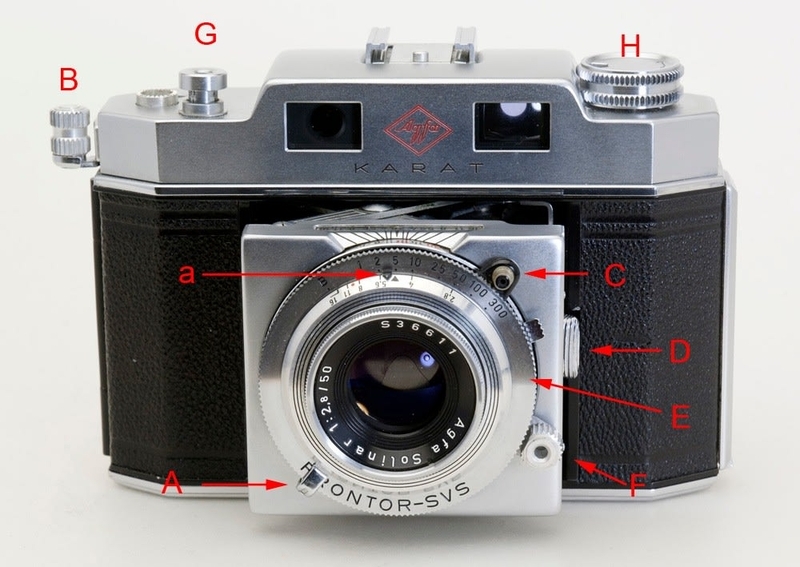 E 捲き戻しノブ eはASA感度記憶用だが変更方法が分からない。抓みの類が無い。露光計が付いて無いので不要とも思えるが